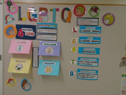 保健室前の掲示もご覧ください。LGBTQについて、考えるコーナーです。