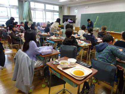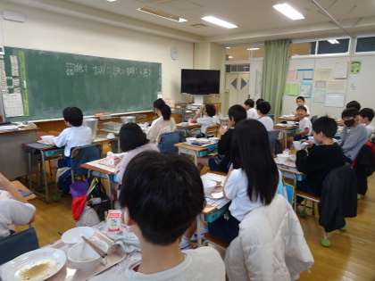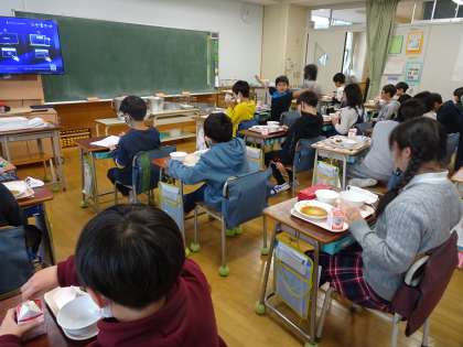 保健給食委員会が、残菜の残りの少ない学級を発表してくれます。食に関心をもてるように、栄養士さんが、給食の歴史を紹介してくださいました。