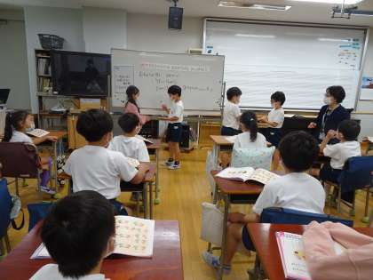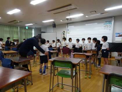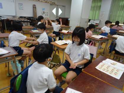 1年1組の音楽は、昔遊びにつながる手遊び歌を歌いました。「おちゃらかおちゃらかおちゃらかホイ」の歌は、保護者の方も皆さん覚えがあることでしょう。