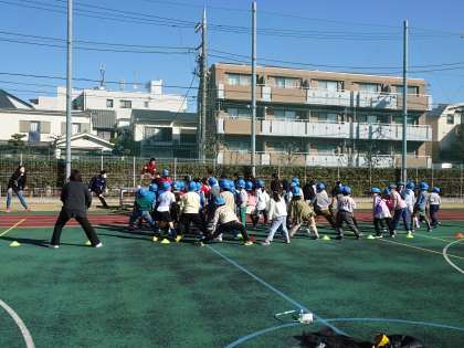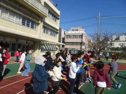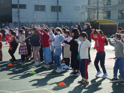 『ジンギスカン』の曲が流れると、皆がストレッチを入れたダンスを楽しんで行います。1年生から6年生までしっかり筋肉を伸ばしています。