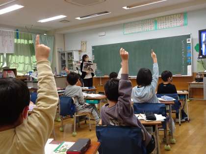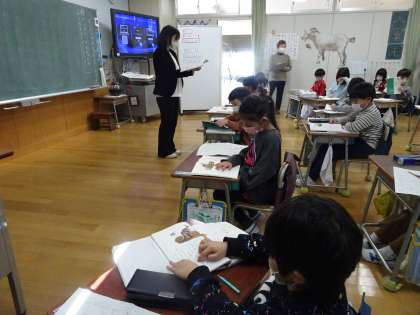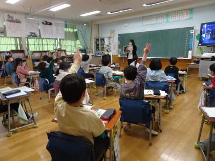 1年生の研究授業は、国語で行いました。『どうぶつのあかちゃん』の文章の読み取りの授業です。1年生なりに、大事な表現を選び、意味を自分の言葉で発表しました。