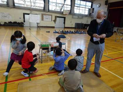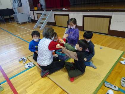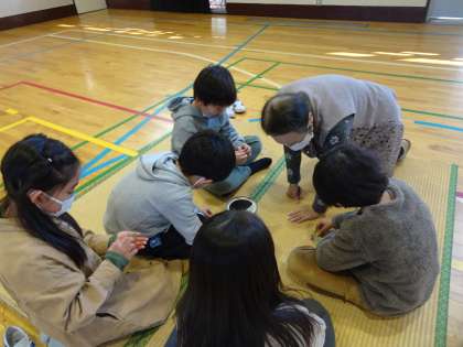 地域の皆様が協力してくださり、1年生と昔遊びをしました。お手玉、木ゴマ、おはじき、あやとり、けん玉など、いろいろなコーナーで、地域の方と関わり、楽しく活動しました。