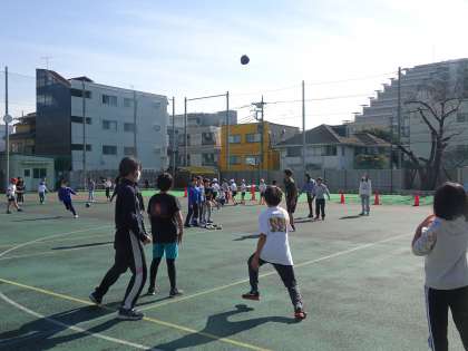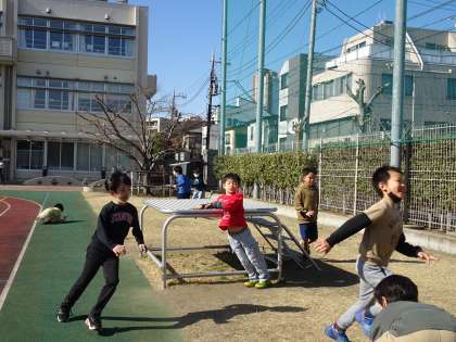 光・暗闇・外遊び の合言葉で、からだと心を考える元気アップ大作戦は、日常的に遊ぶ子どもたちになってほしいなという願いも入っています。2年生の鬼ごっこも、楽しそうです。