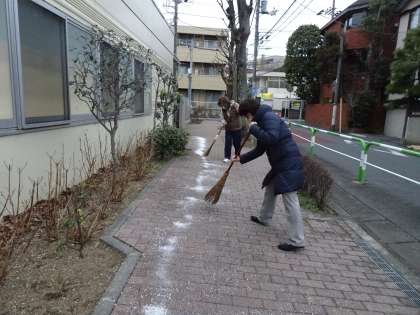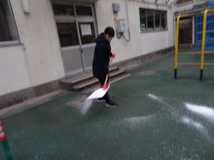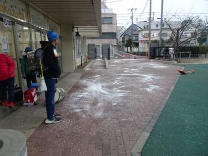 この白い粉は、雪ではありません。雪が積もったら、溶かす役目をする粉です。主事さん、先生たちで子どもたちの通路に撒きました。登校前の風景です。