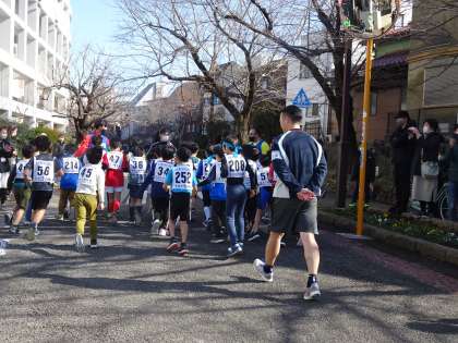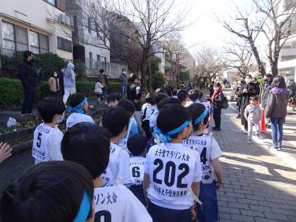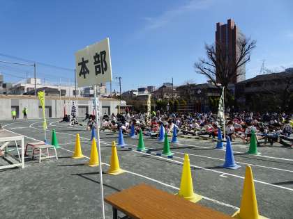 素晴らしい晴天になり、子どもたちはやる気満々で出場しました。太子堂小学校、三軒茶屋小学校、その他、いろいろな学校の児童と競い合う体験でした。1年生から6年生まで、奮闘しました。中里ブルーのはちまきが中里小の目印です。