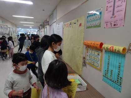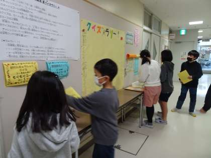 校内のいたるところに、カードが貼ってあります。ウォークラリーの要領で、クイズに答えていきます。保健・給食委員会の児童が考案した企画は、とても人気があります。