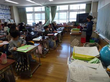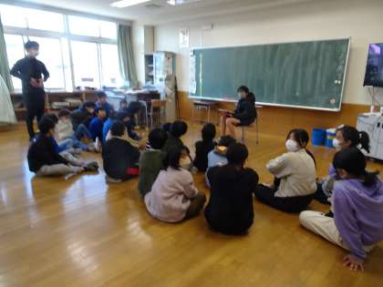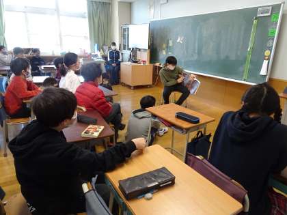 皆、真剣に聞いています。読み手は、5年生、6年生の図書委員です。本を選ぶところからやっています。