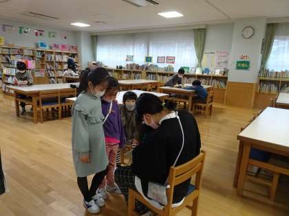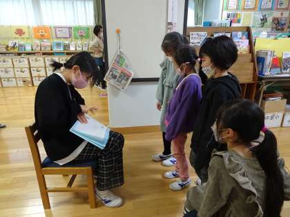 図書室では、6年生に読み聞かせをしてもらっています。のびのびと図書室を使っています。読書週間には、本を何冊くらい読んだでしょうか。