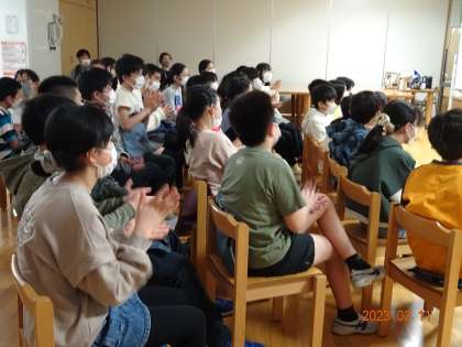 毎日の自分、明日の自分、他者を思いやる心、のんびりと感じることの大切さ。いろいろな感想をもった6年生です。6年生のために、心を込めて練習を重ねてくださったお話工房の皆さんです。