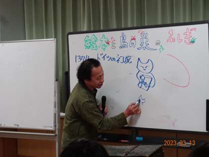 校長先生による『沖縄戦の歴史』、お話工房による『ピアノが流れる読み聞かせ』に続き、絵本作家鈴木まもるさんによる『鳥の巣の話』。あっと言う間の90分でした。もっともっと聞きたくなる素敵な命のお話でした。