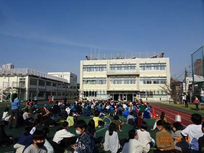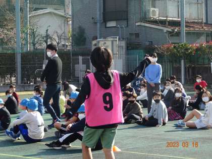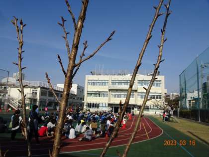 芝生に移動したアウトの人も再チャレンジできるように、2回戦目もありました。リセットできるルールも、よく考えられています。90周年記念樹から校庭を撮影しました。芽が出てきています。