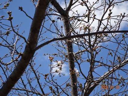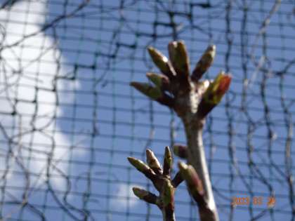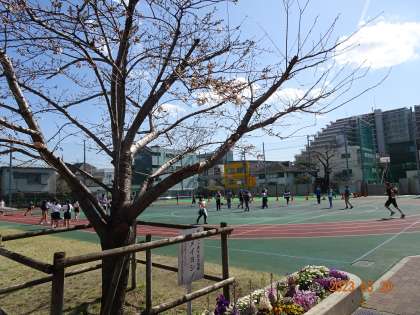 90周年記念樹に、新しい芽が出ていました。枝が高くなり、芽も膨らんでいます。その枝のすきまから、校庭を撮影しました。