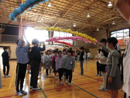 各学年、1年生へのプレゼントや、花のアーチ、出し物(猛獣狩りへ行こうよ!)、あいさつなどで、温かく1年生を迎えました。