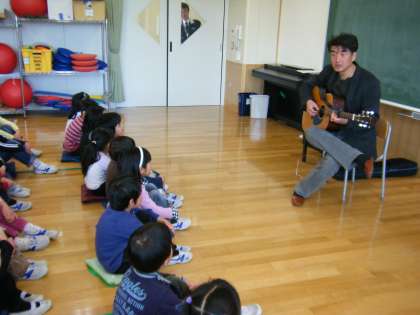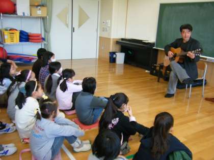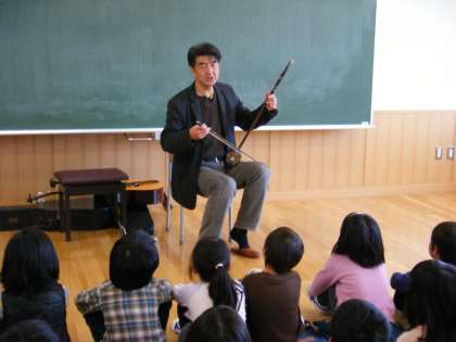 1〜3年生は、二胡とギターを使った演奏家「芳晴」さんの、お話と歌、演奏を聴きました。途中、一緒に歌に参加する場面も準備してくださいました。プロの方の演奏は、心にしみ、子どもたちは笑顔にあふれていました