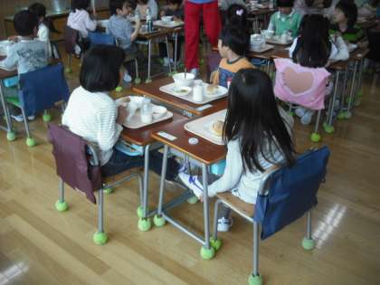 小学校に入って初めての給食でした。みな、おいしそうに、食べていました。教職員、給食担当も一安心でした。給食の味、みんなで食べたこと、準備や片づけの様子など、おうちでの話題にしていただければ幸いです。