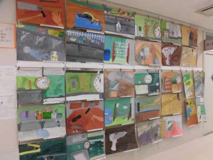 本校は、行事としての「展覧会」は実施していませんが、その分、日々の校内図工作品展示には力を入れており、廊下やホールには、子どもたちの力作の数々が日頃から展示されています。
