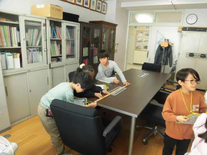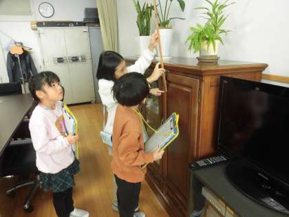 校長室の様子に興味津々ながらも、課題である長さの測定は、友達と協力して真剣に取り組みました。