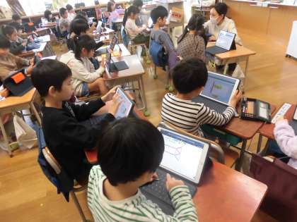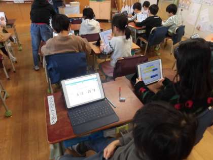 1年生が、デジタル教材で、算数の問題に取り組んでいました。