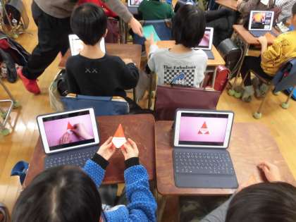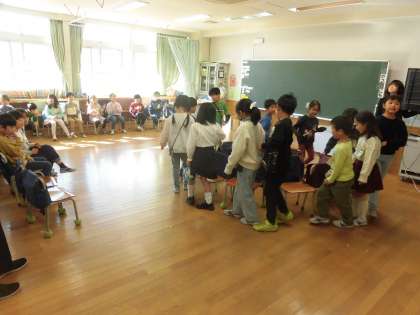 写真は、左、いす取りゲーム(1年生)、右、折り紙サンタ(3年生)の活動です。