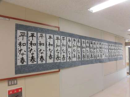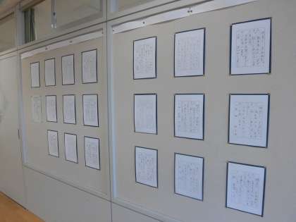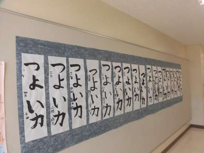昨日の書初め大会で、それぞれに渾身の筆遣いで書き切った作品が、各学級に展示されています。