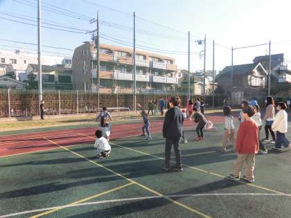 写真は、校庭で「だるまさんがころんだ」をしている様子です。
