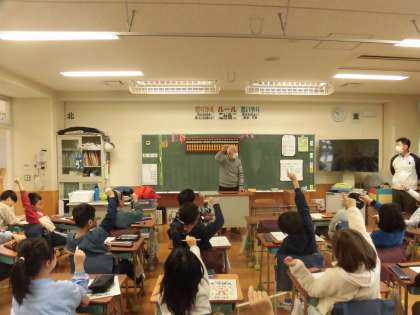 指の使い方を、黒板のそろばんで確認しながら学習していました。