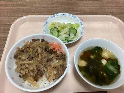 今日は給食ではレア食材の牛肉を使って牛丼を作りました。