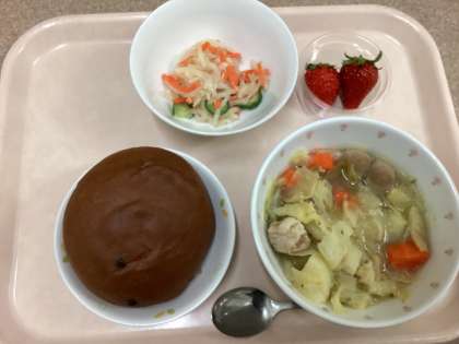 チョコチップパンの献立です。普段の生活で、菓子パンを