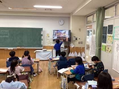 タブレットの画面が映し出されたモニタで、クラスの友達に説明をしています。