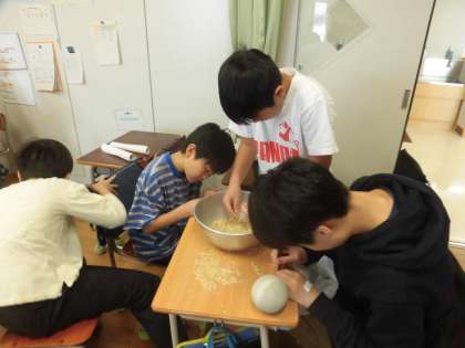 収穫した稲の精米作業を行っています。それぞれのグループで考案した方法で、精米をしていました。ハサミなどで、叩きながらぬかを取る方法や、ソフトボールを転がして押しつぶすようにして精米する方法などを試していました。