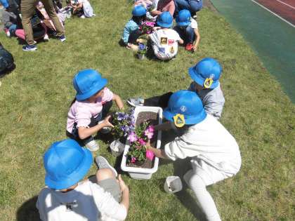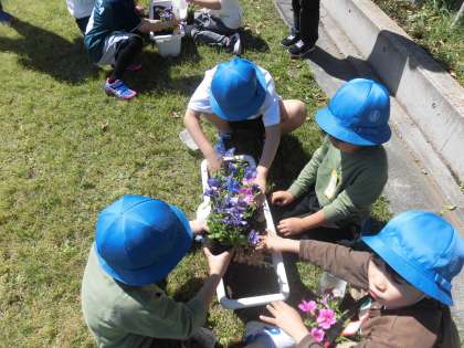 手が汚れてしまうことに躊躇する子もいましたが、ペチュニアの苗を包むようにしっかり持って、プランターに植え替えていました。