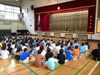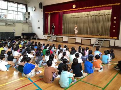 スポーツテスト各種目の説明を、体育委員会の子どもたちがステージで実演してくれました。