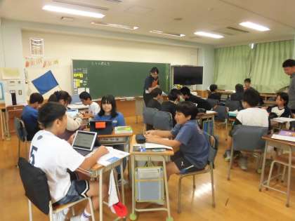 酸素の特徴を、自分の言葉で表現し、それをタブレットを使って友達と共有していました。友達と、気軽におしゃべりするような雰囲気で、自分の考えを自由に伝え合う姿がとても微笑ましく「協働的な学び」のあり方の一つのヒントとなりました。