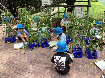 この暑さで、朝顔の花がしおれ気味でしたが、「また、お水をあげると元気になるよ。」という担任の声掛けに「よかった〜!」と安心する声が聞こえてきました。