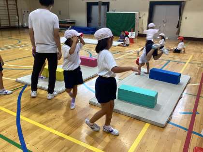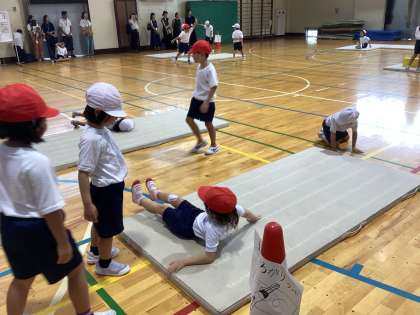マットを使った運動遊び。いろいろな方向に転がったり、ジャンプしたり、ローテーションしながら、様々な運動にチャレンジしていました。