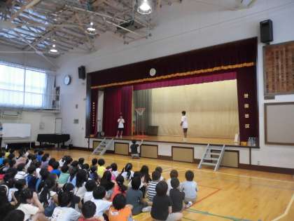 体育委員の児童が、それぞれの運動のコツやねらいを実演で説明してくれました。