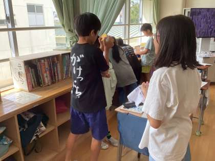 写真は、水をできるだけ早く動かしたときに、中に入れたスポンジにどんな変化が出るのか、を実験しているところです。