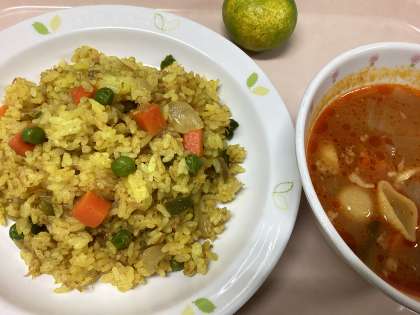 今日はカレー粉の辛みをきかせたスパイシーピラフ。