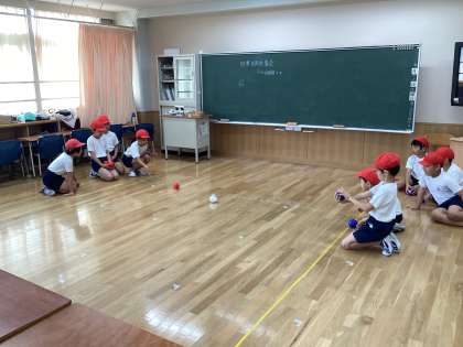 下の写真は、広い教室を生かして、ボッチャを行っていました。