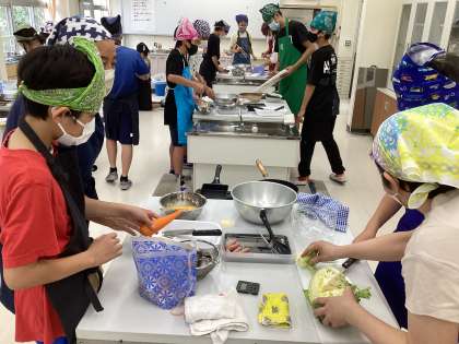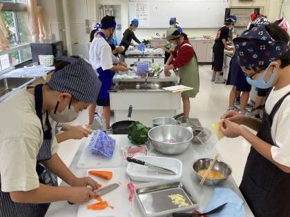 各班で計画したレシピに沿って(具材や調理方法がそれぞれに違っていました)、肉野菜炒めを作っています。