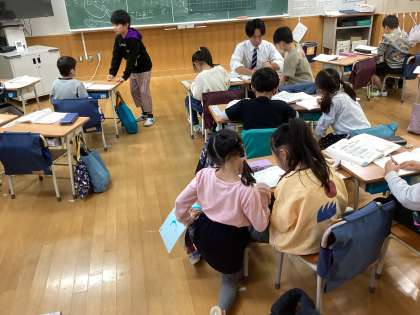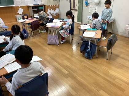 写真は、教え合いタイムで、隣の子に教えたり、分からない子のところへ「出張」して教えたりする姿が見られます。1年生のうちから、このように共に学び合う習慣を身につけることは、とても大切だと感じています。