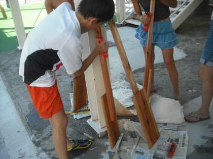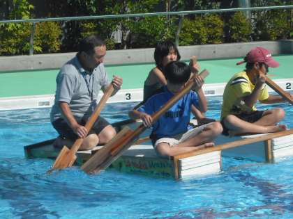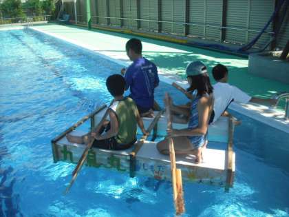 アドベンチャーin多摩川「多摩川のいかだくだり大会」が8月26日に、多摩川の第三京浜の下あたりを会場として行われます。中里小学校も参加することになりました。中里小からは、2艇参加します。10時50分スタートです。よろしかったら、ぜひ応援にいらしてください。8月23日は、できあがったいかだをプールに浮かべ、試乗してみました。オールは、持ちやすいように、各自でやすりをかけました。