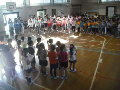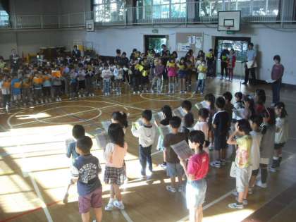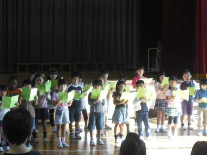 今月の詩の朝会は、1年生がメインでした。声をそろえ、大きな声で、小さな声で、大勢で、一人でと、また、1年が、2年が、3年〜6年がと、詩の雰囲気に合わせて表現することができました。秋空にすがすがしい声が響いた朝会の時間でした。