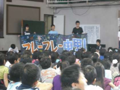 朝会で、6年生から決意の言葉がありました。あさってに控えている連合運動会に向けて、努力してきた報告、1年生からの横断幕のプレゼントを始め、朝や休み時間の練習中にも応援してくれた、1〜5年生そして、先生へ、感謝の気持ちと、決意表明がありました。場の雰囲気にのみこまれず、一人一人が自分の目標の記録に挑戦してほしいと思っています。