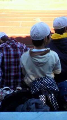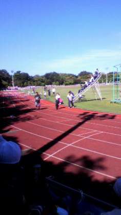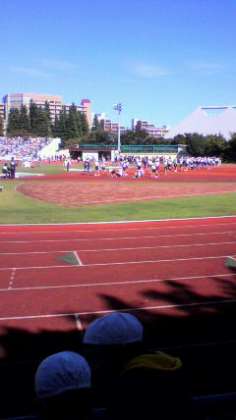 素晴らしい好天ですが、日陰の席は、寒く、、、。男子は、身を寄せあっての応援です。