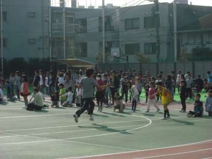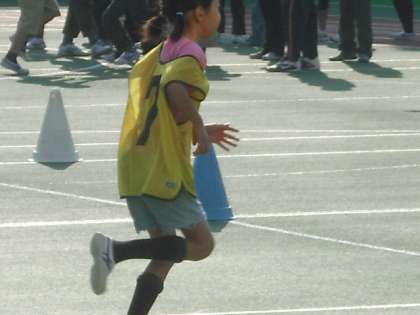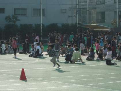 秋晴れの中、運動集会を行いました。今日は、学年対抗でした。学年によって、途中にコーンがあったり、フラフープをくぐったりと工夫されていました。1年生が一番早かったです。