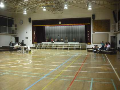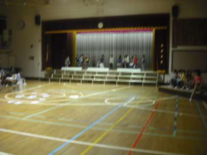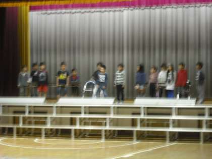 大雨が体育館の屋根を叩き、体育館中を響かせています。また、雨のせいで、気温もかなり低い体育館です。その中、学芸会の練習をわりあての時間を有効に、頑張っています。雨音に負けずに声を張り上げる子どもたちの姿に、心打たれます。