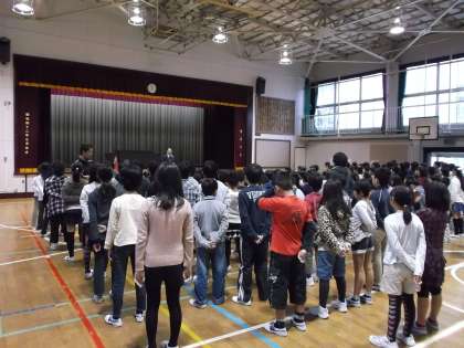 今週はあいさつ週間です。今日から、運営委員会の児童が当番で校門に立って、あいさつを促しています。ユニセフ募金も同時に行っています。この機会にあいさつについて、あらためて、努力してほしいと思います。そのあとの全校朝会では、校長先生から、スポーツで行われる試合では勝つことに力を入れていきましょう。ただし、負けた側の気持ちも大事にしてほしいこと。先週行われた就学時健康診断で、5年生の活躍は素晴らしかったこと。のお話がありました。また、週末に好成績を残したサッカークラブの表彰もありました。