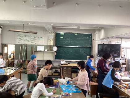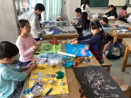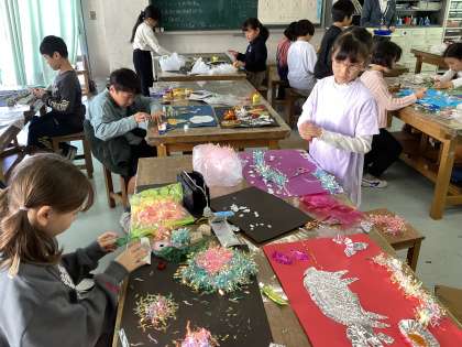 大胆に素材を折ったり、グシャグシャにしたりして貼り付けています。また、丁寧に細かく切って糊づけしたりと、思い思いに仕上げていました。