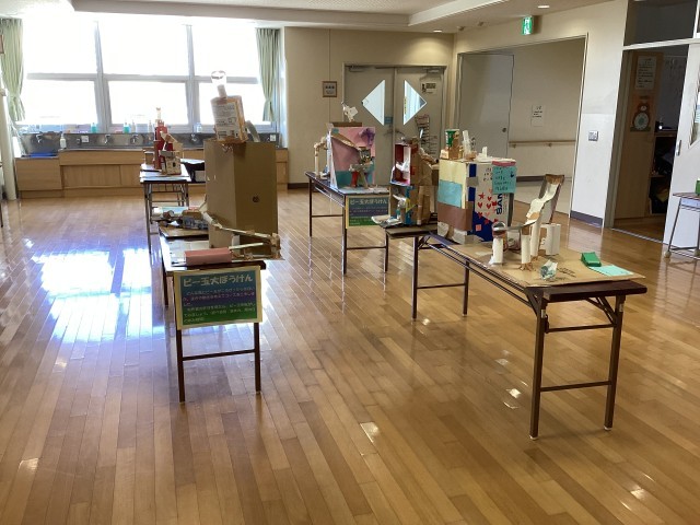 段ボールを使って、ビー玉が転がっていく仕組みを作ります。大きな作品ですが、ビー玉が様々なコースを辿りつつも、スムーズに転がっていくような様々な工夫がされています。